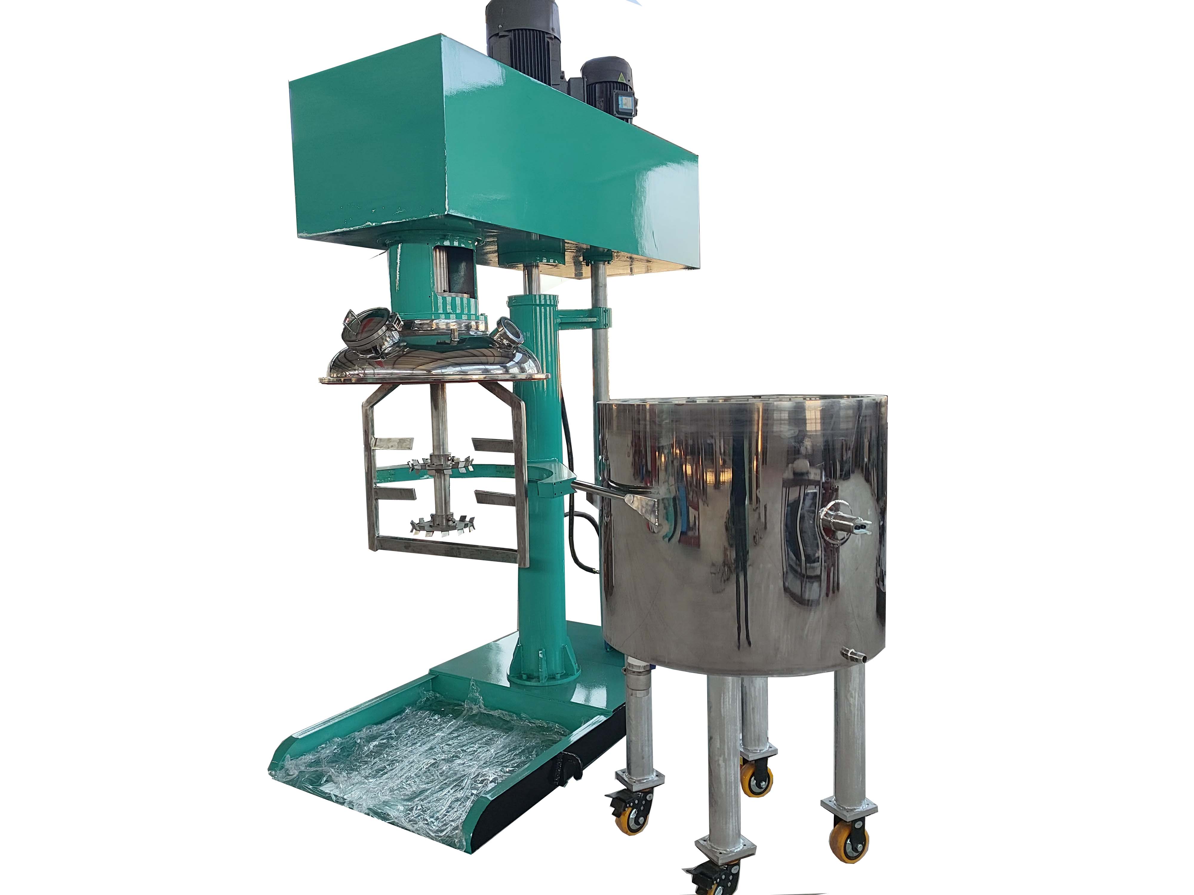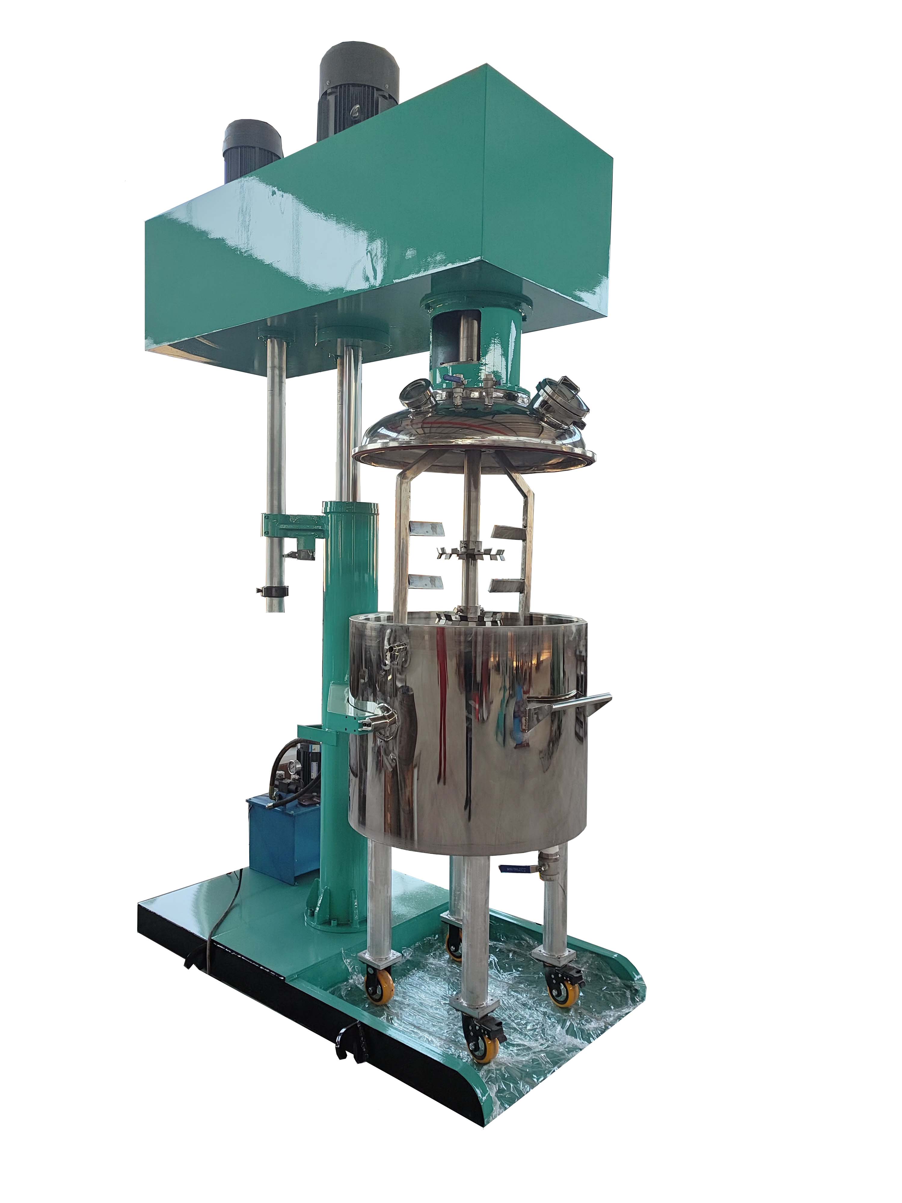 高、低速雙動力設(shè)計;匹配的動能驅(qū)動高速分散器高速旋轉(zhuǎn)使攪拌缸內(nèi)的液體物料呈現(xiàn)滾動的環(huán)流,并產(chǎn)生-定范圍的旋渦,物料同時受到較強(qiáng)的剪切和沖擊,配合帶有活動刮壁的低速攪拌器,把粘附在容器壁上的物料推向高速分散器的做功范圍,使兩種或兩種以上的物料很快得到分散、混合,使產(chǎn)品無色差、均勻度好、 透明度高??蚴綌嚢杵髦饕鉀Q拌合及物料粘壁問題,物料分散主要由中心分散器完成,從而各取所長,避其所短,使攪拌更快速,效率更高,混合更充分。根據(jù)工藝情況,高速實心軸與低速空心主軸間以及低速空心主軸與機(jī)架間均可安裝機(jī)械密封,從而實現(xiàn)真空作業(yè)。