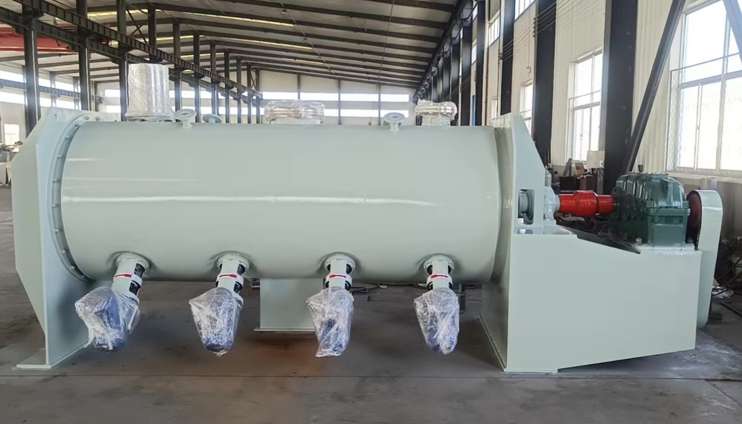 混合機結(jié)構(gòu)主要由傳動部分、臥式筒體、犁刀組軸、飛刀組、出料閥、噴液裝置等組成。